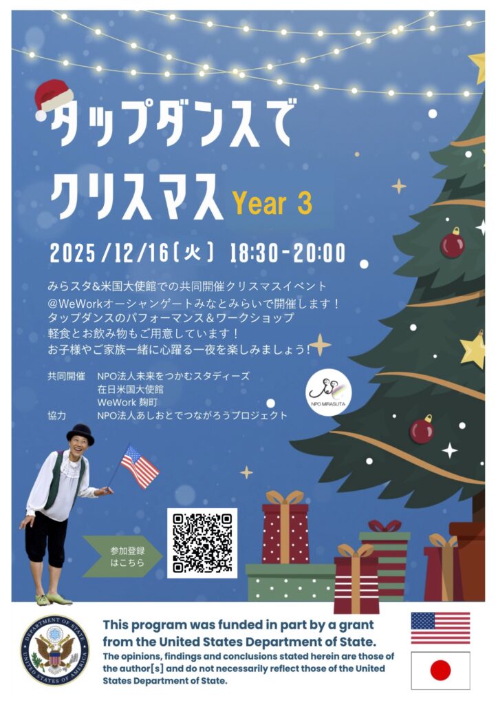 みらスタ&米国大使館での共同開催クリスマスイベントにおどるなつこが出演します。タップダンスのパフォーマンス&ワークショップと軽食&ドリンクなど盛りだくさんでお届けします。心躍る一夜を楽しみましょう!